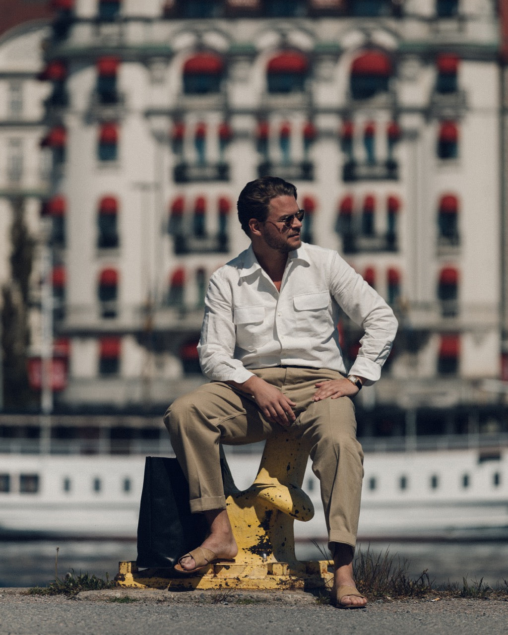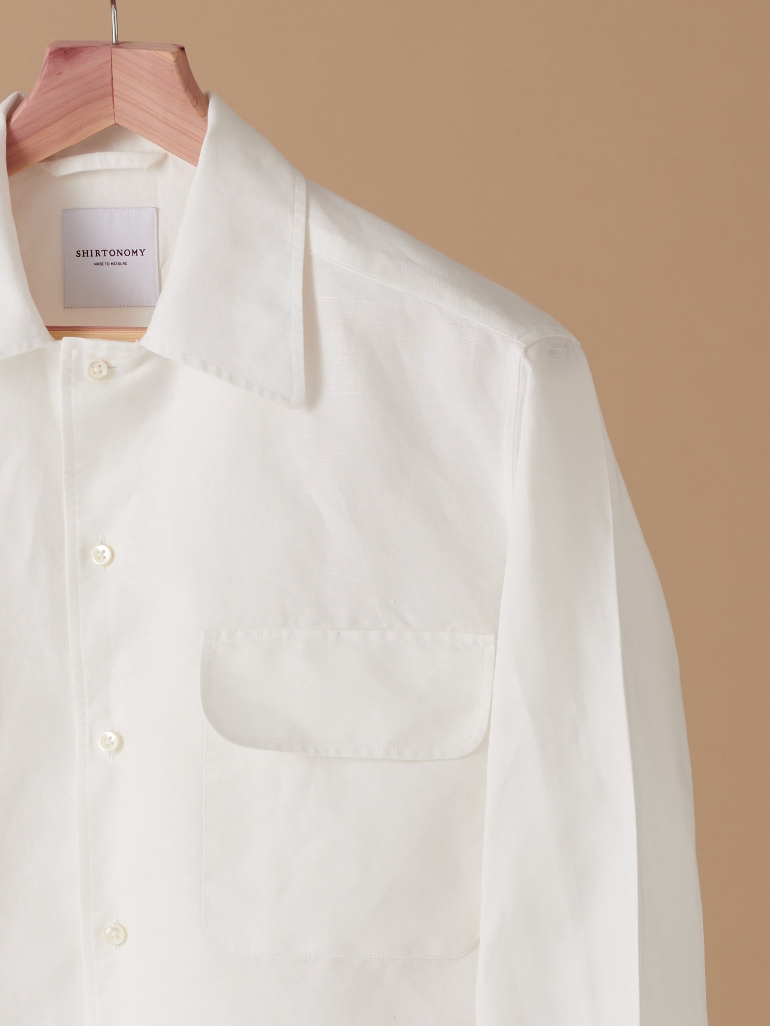 A relaxed shirt model with a classic interpretation of the so-called camp collar. The shirt looks best when the top buttons are left undone, allowing the placket to roll out into small lapels. This shirt model evokes associations with adventure and rugged masculine elegance. It pairs perfectly with a pair of swim shorts on the beach or with jeans/dress trousers for an evening out. Wear it under a blazer and let the collar rest over the lapels for a classic yet relaxed look. The collar resembles our turndown collar, with long, rounded collar points. The shirt features two chest pockets with flaps and is made from a canvas-like fabric blend of cotton and hemp. NOTE: the design of our Safari shirts is fixed and cannot be altered. However, you can use your usual measurement profile when ordering.