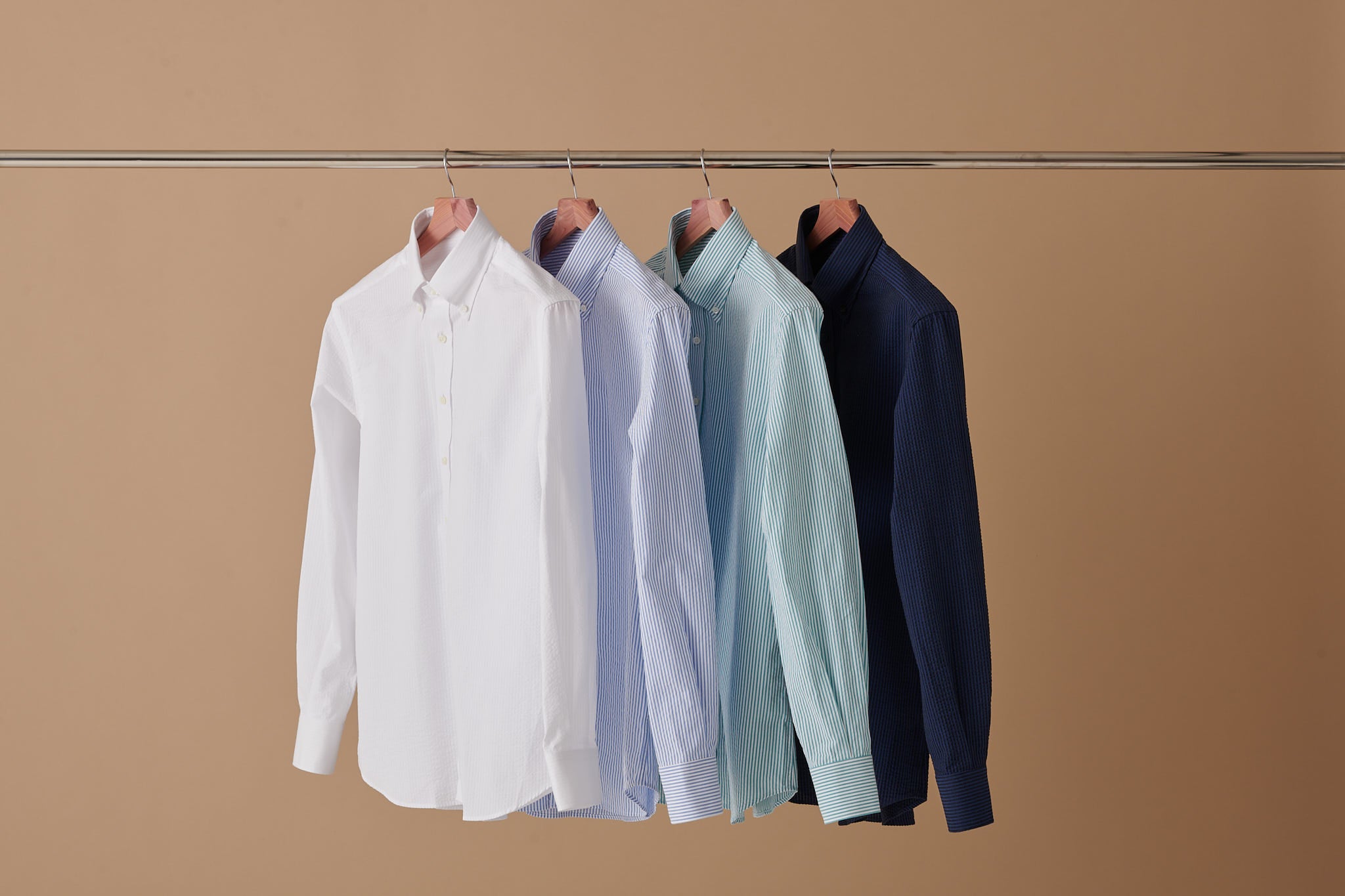 Bengal striped fabric in seersucker quality. Seersucker is characterised by the naturally wavy structure that makes the fabric feel airy and cool on hot days. A stylish and relaxed choice for both the swim trunks and the linen blazer. Tip: you can adjust how noticeable the seersucker structure should be by how hard you press/iron the shirt after washing.