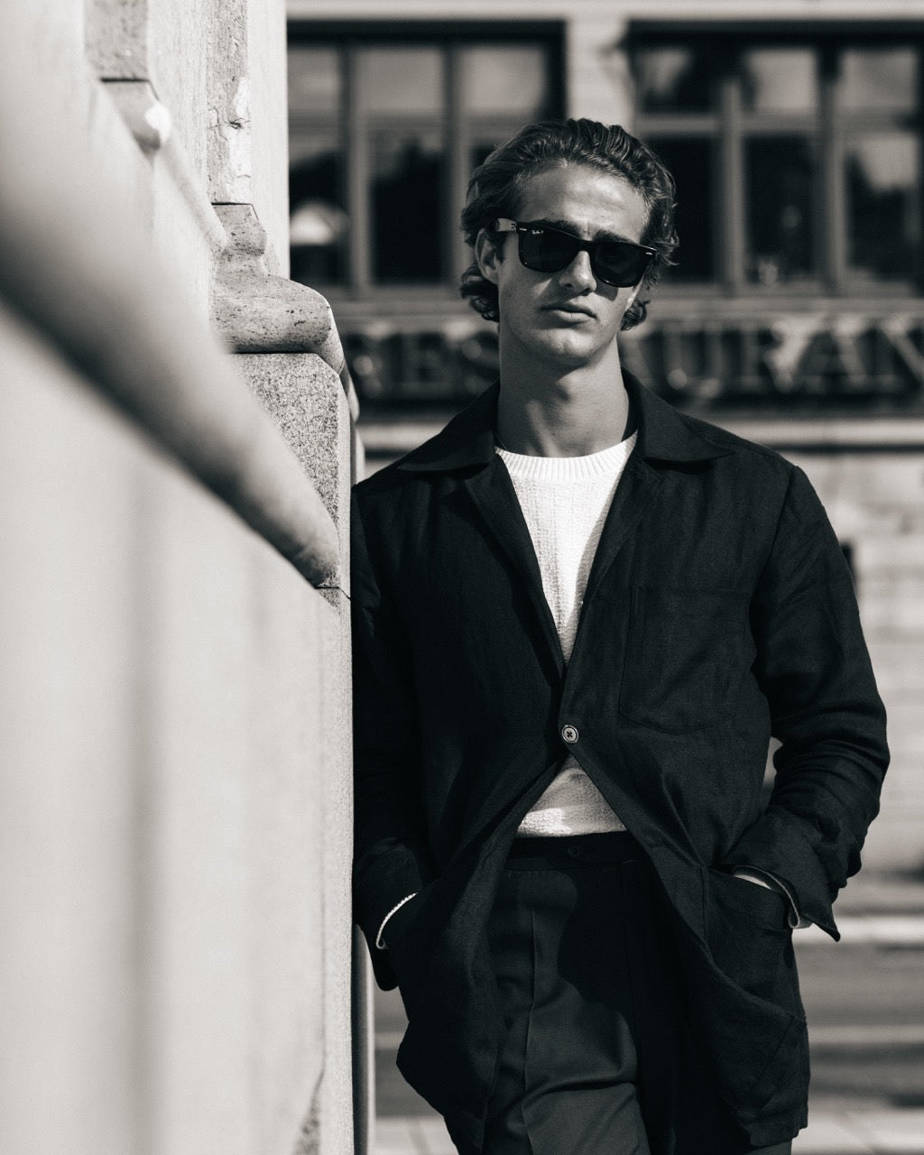Overshirt i svart linne. Denna overshirtmodell tillverkas med en knappslå som, när den är oknäppt, får en rullad öppning som påminner om en camp collar (även känd som bowlingkrage). Plagget är inspirerat från Rivieran på 70 talet och är det perfekta valet när du vill klä dig i något som är mer dressat än en cardigan men mindre formellt än en kavaj. Praktisk, rustik och stilfull på en och samma gång. Du bär den förslagsvis över en t-shirt, polotröja eller skjorta. Tygets grova oxfordväv ger tyget rätt tyngd och fall. Övriga designattribut består av turndown-krage, stora hornknappar, tre stycken droppformade fickor, rak skärning i nederkant samt enkel rund manschett. (OBS: designen för våra overshirts är låst och kan inte alterneras). OBS: TÄNK PÅ ATT DU BEHÖVER SKAPA EN SPECIFIK MÅTTPROFIL VID BESTÄLLNING AV OVERSHIRT!