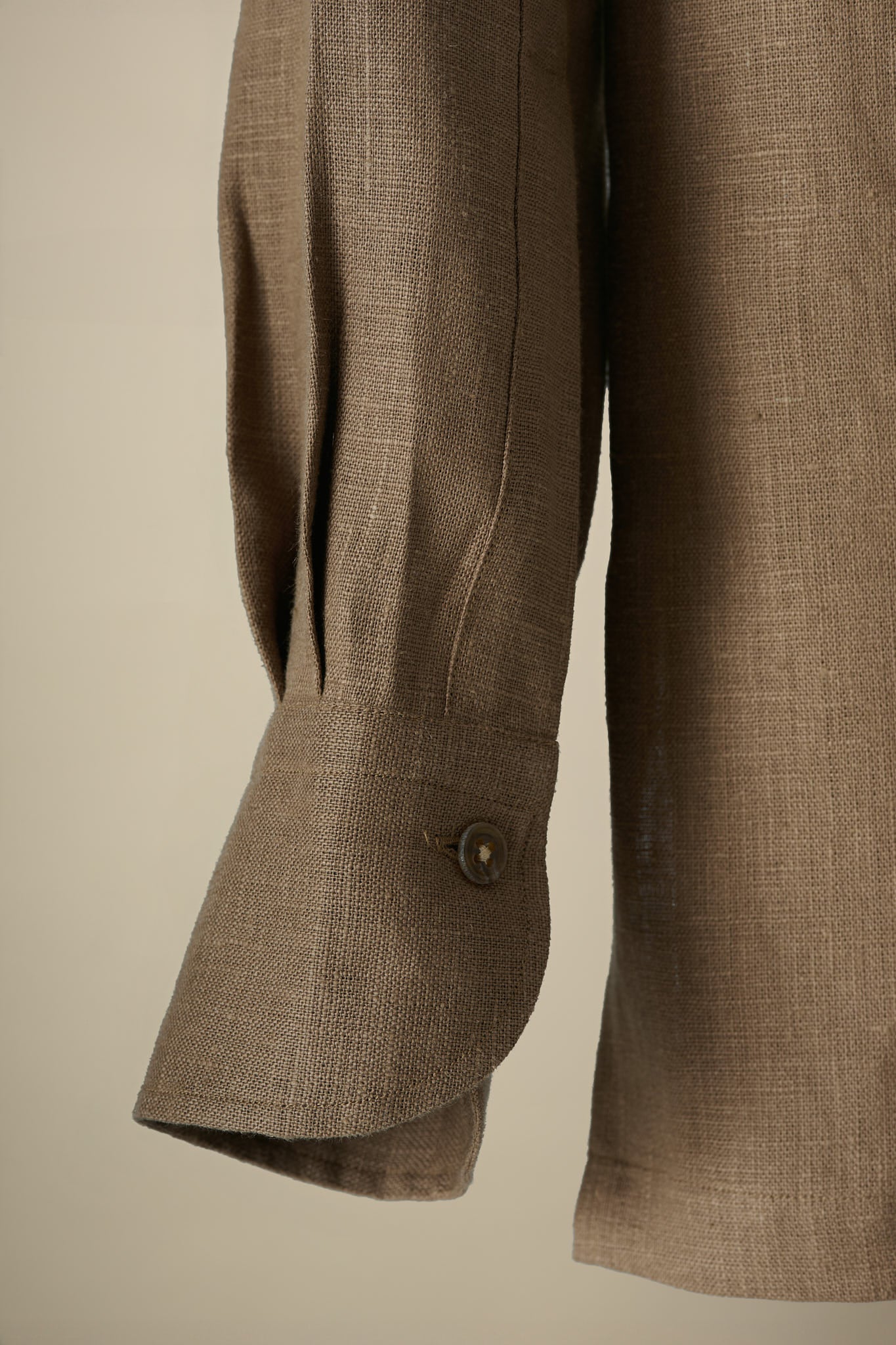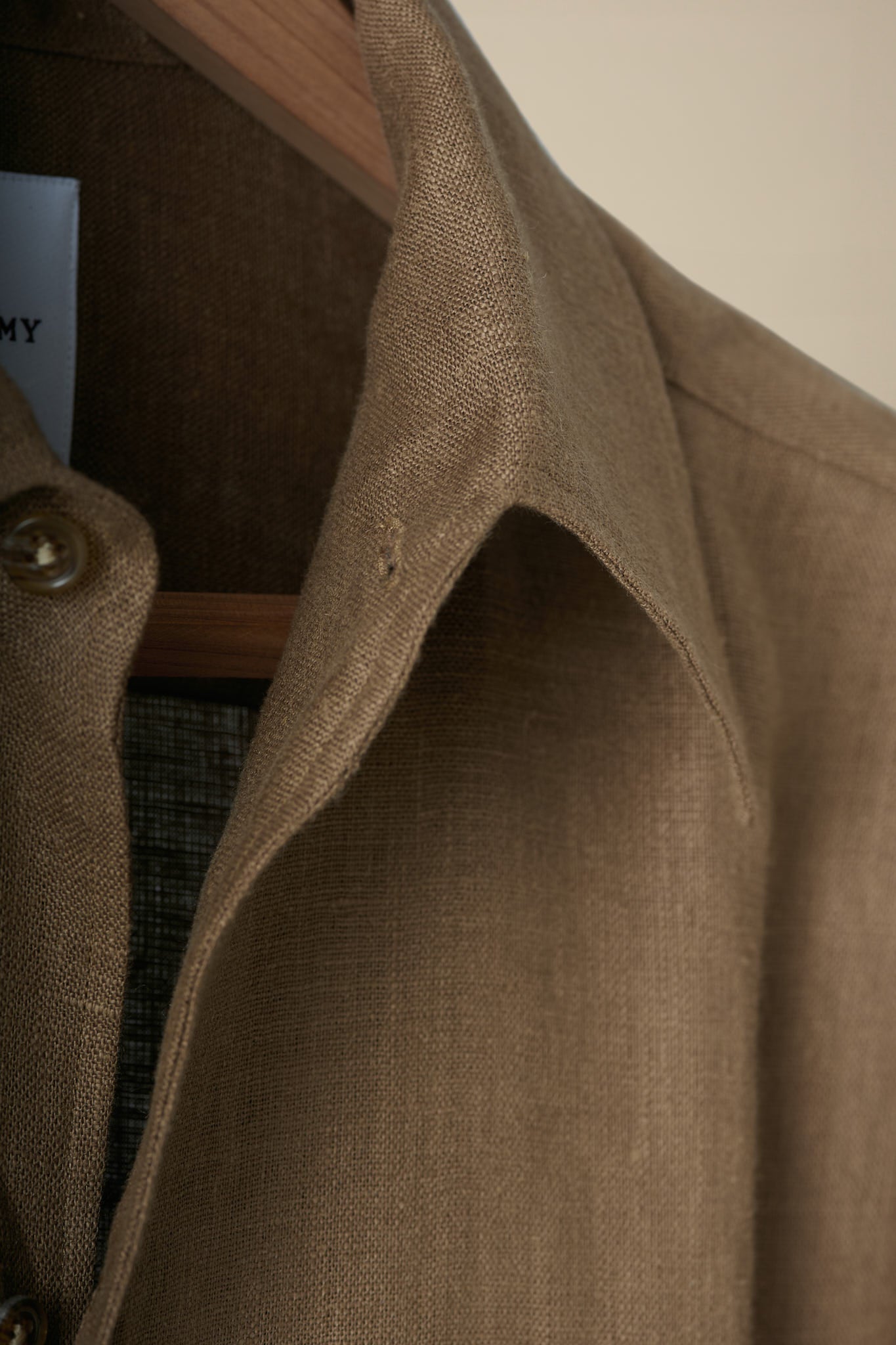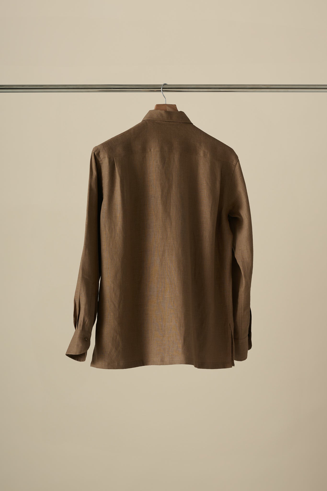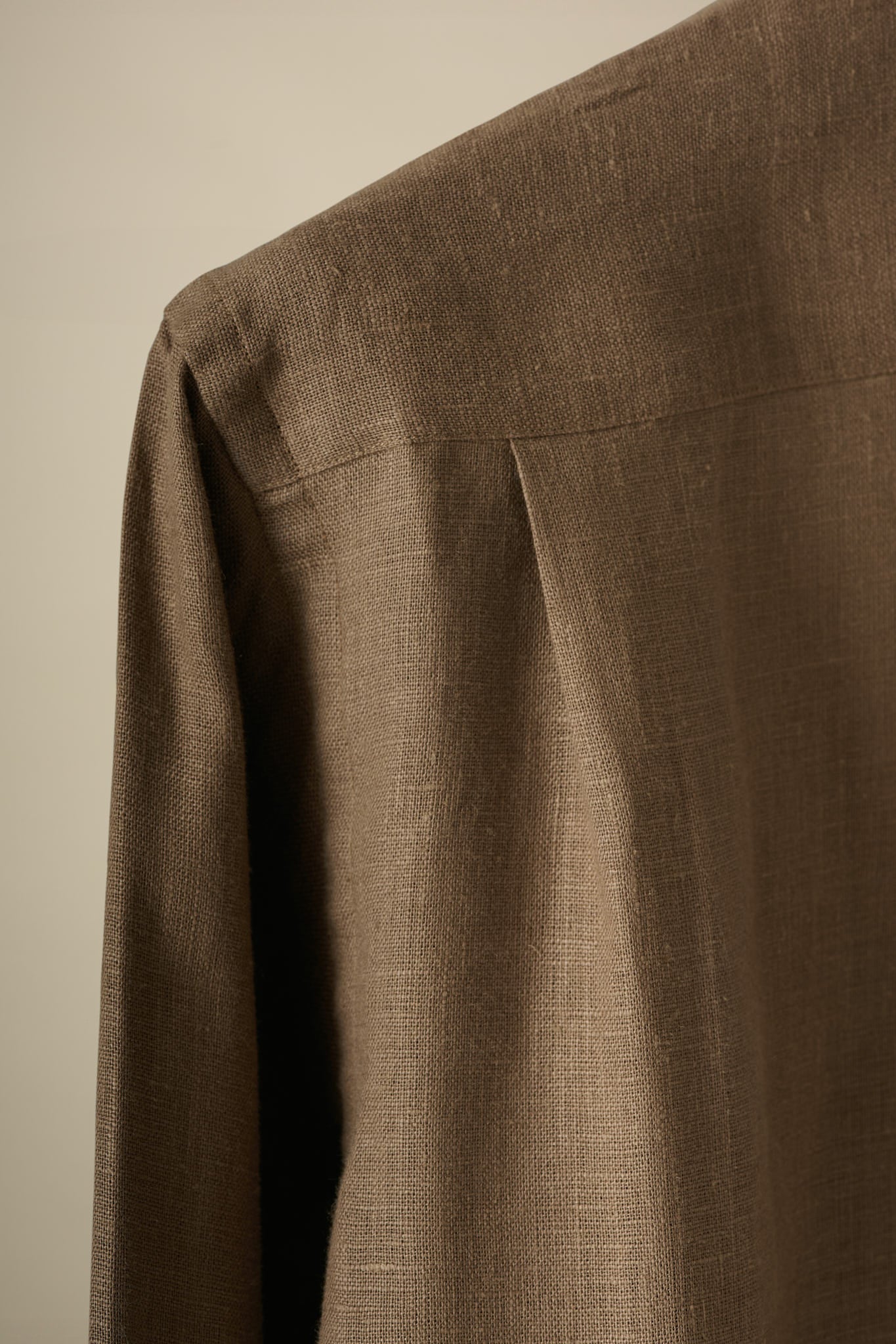 Skjortan är sydd i ett tvättat linnetyg i en tobaksbrun ton. Tygets tyngd ger plagget ett visst fall, vilket gör att det fungerar både direkt mot huden och som ett luftigare lager över linne eller t-shirt. Med sidoslitsar, ryggveck och en avslappnad silhuett är det också ett ledigt men genomtänkt alternativ till kavaj i mindre formella sammanhang.