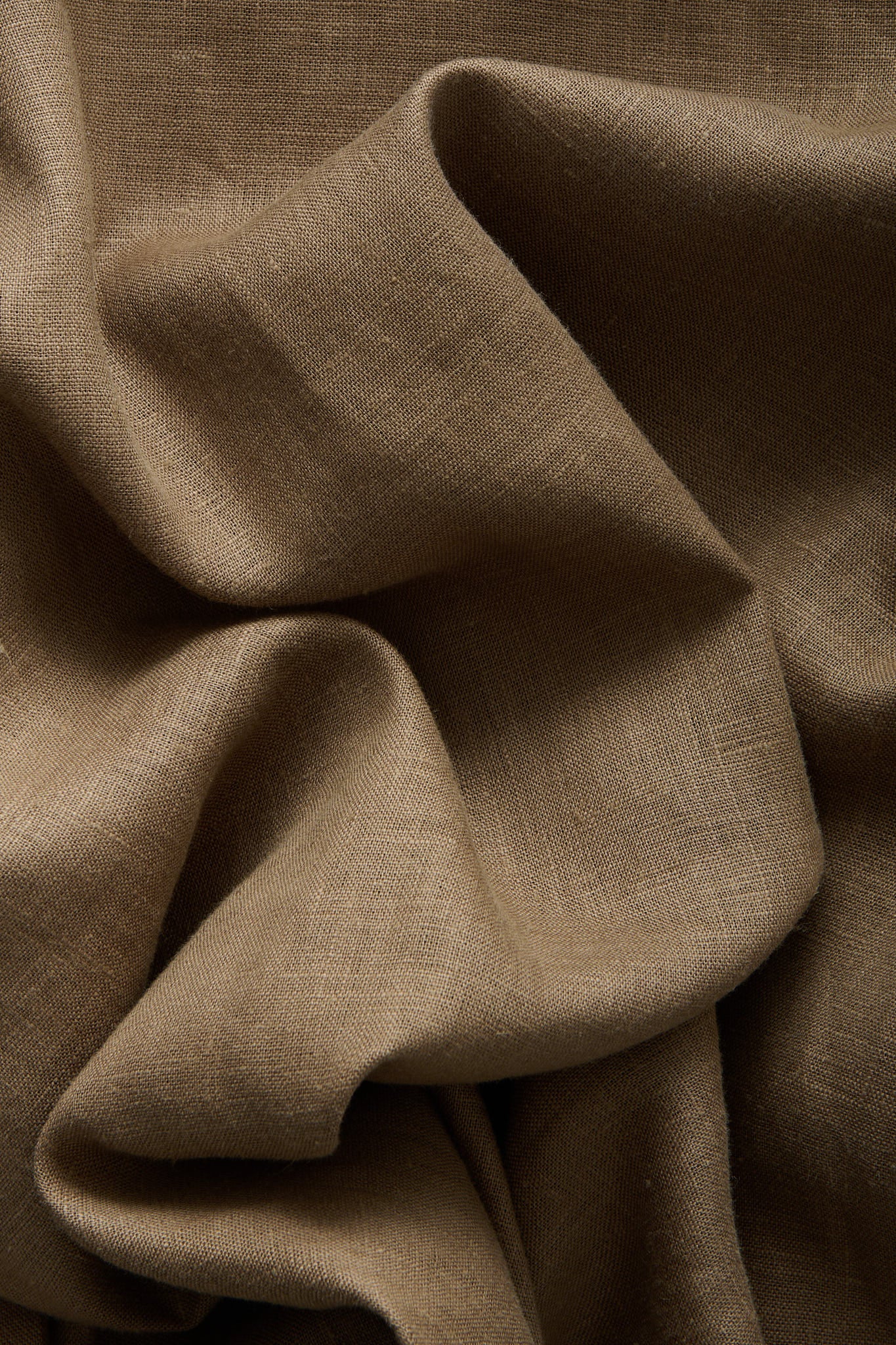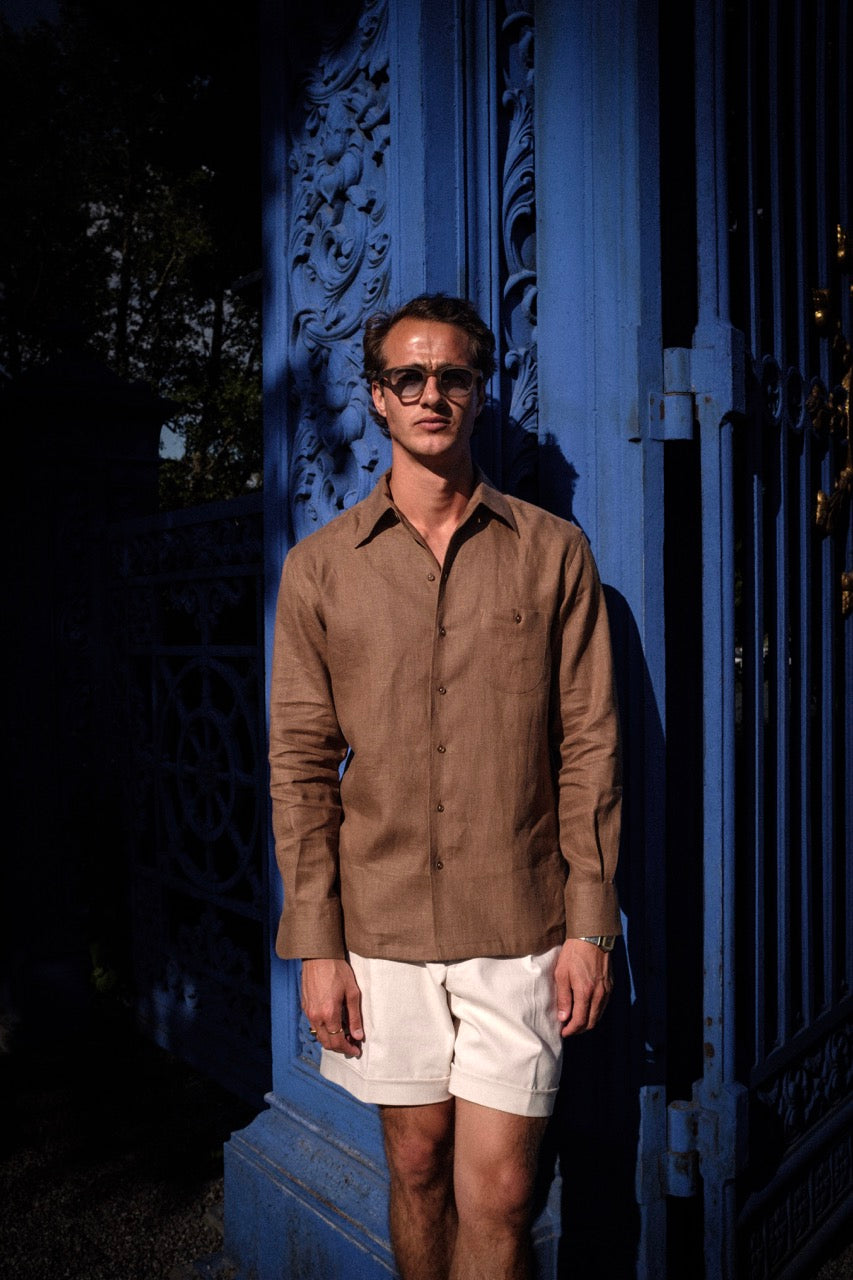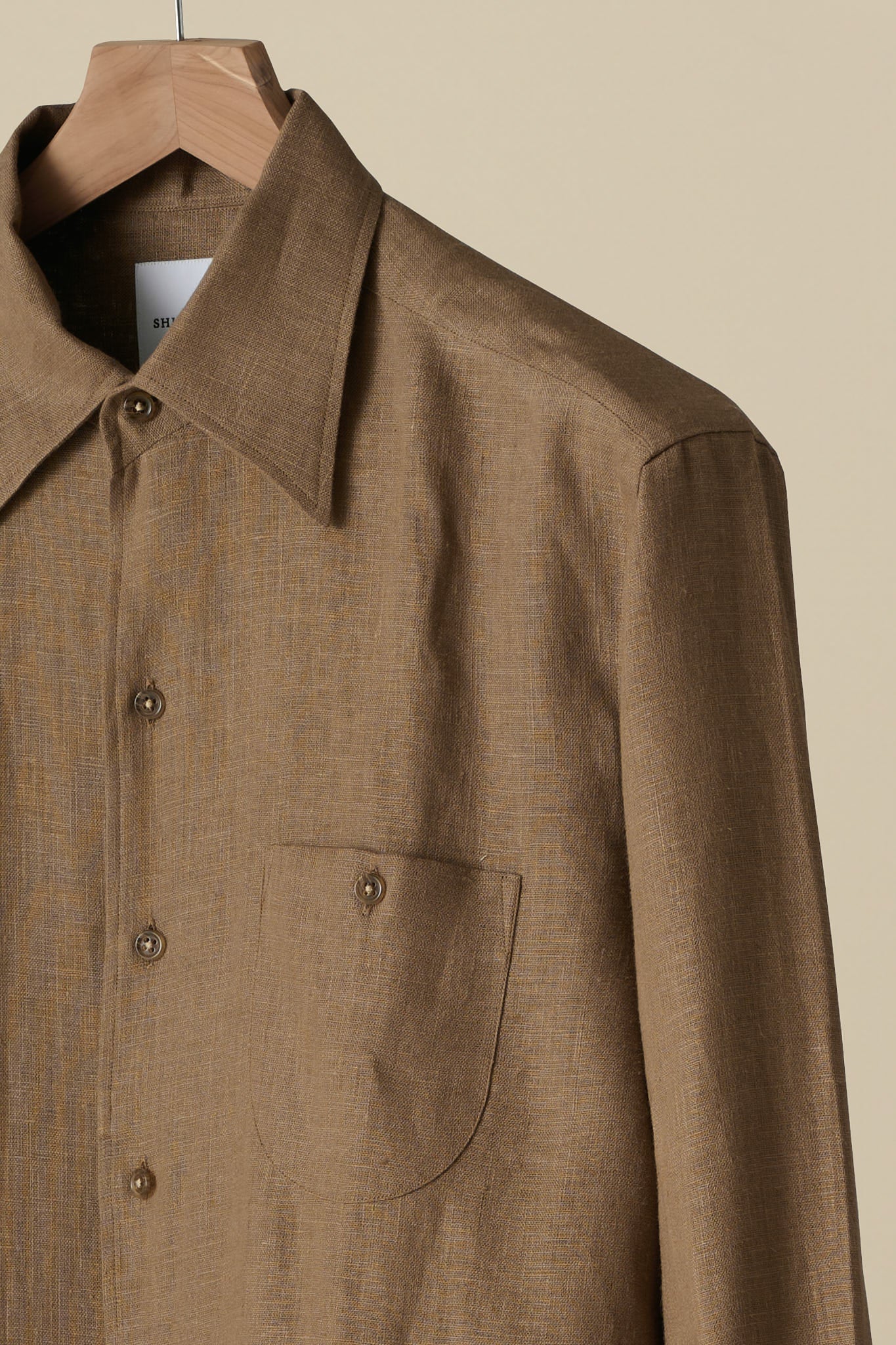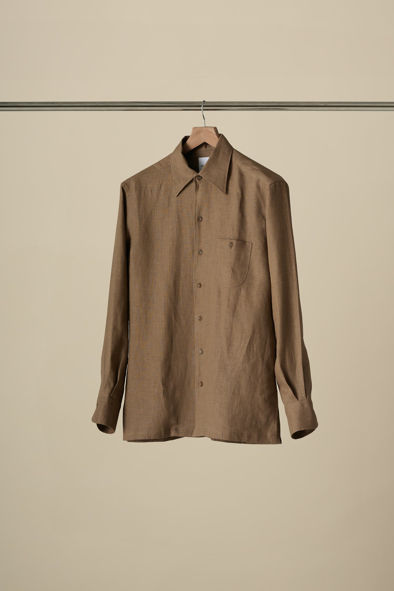 Skjortan är sydd i ett tvättat linnetyg i en tobaksbrun ton. Tygets tyngd ger plagget ett visst fall, vilket gör att det fungerar både direkt mot huden och som ett luftigare lager över linne eller t-shirt. Med sidoslitsar, ryggveck och en avslappnad silhuett är det också ett ledigt men genomtänkt alternativ till kavaj i mindre formella sammanhang.