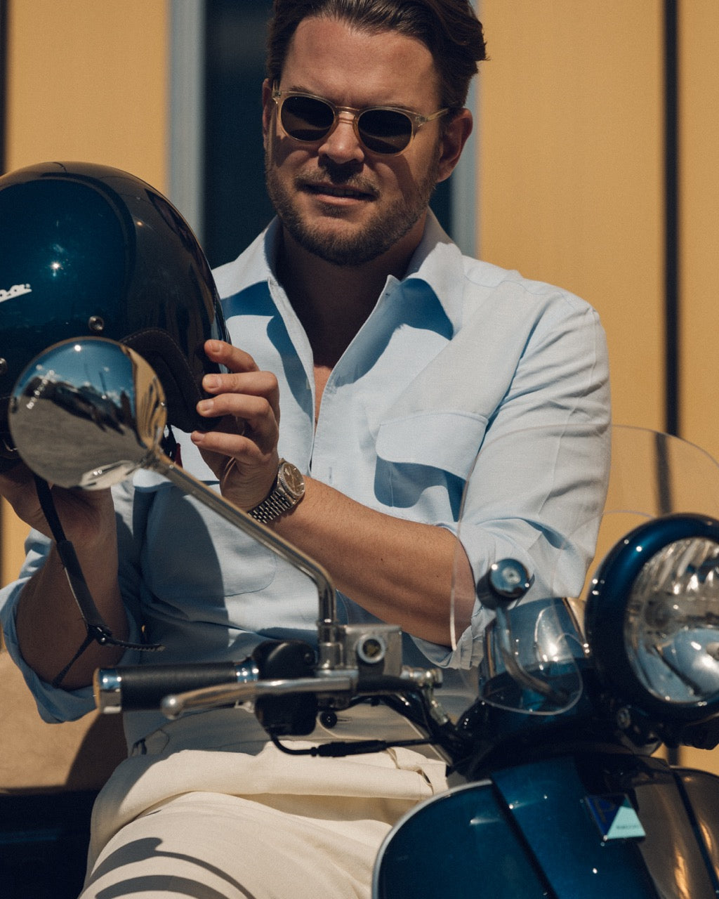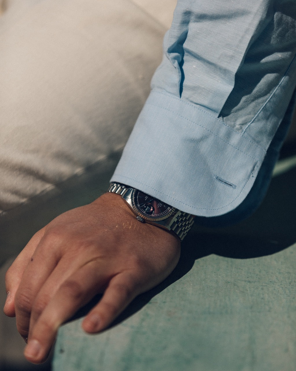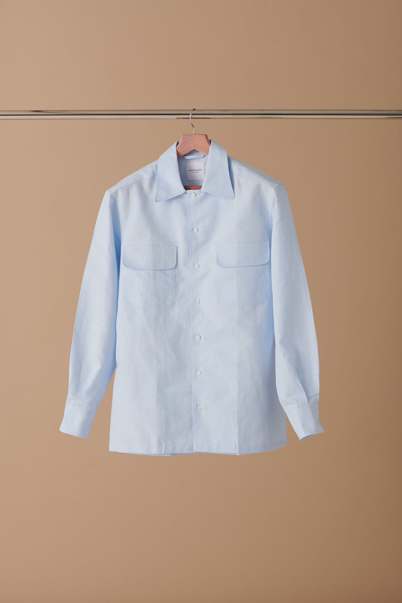 En ledig skjortmodell med en klassisk tolkning av en s.k. camp collar. Skjortan ser bäst ut när de översta knapparna är uppknäppta och knappslån får rulla ut till små slag. Skjortmodellen ger associationer till äventyr och robust maskulin elegans. Den passar utmärkt med ett par badshorts på stranden eller med jeans/dressade byxor under en utekväll på stan. Bär den gärna under en kavaj och låt kragen vila utanpå slagen, för en klassisk men avslappnad look. Kragen liknar vår turndown-krage, med långa och rundade kragsnibbar. Skjortan har två bröstfickor med lock och tillverkas i en kanvasliknande tygkvalité av bomull och hampa. OBS: designen för våra Safari-skjortor är låst och kan inte alterneras. Du använder dock din vanliga måttprofil vid beställning.