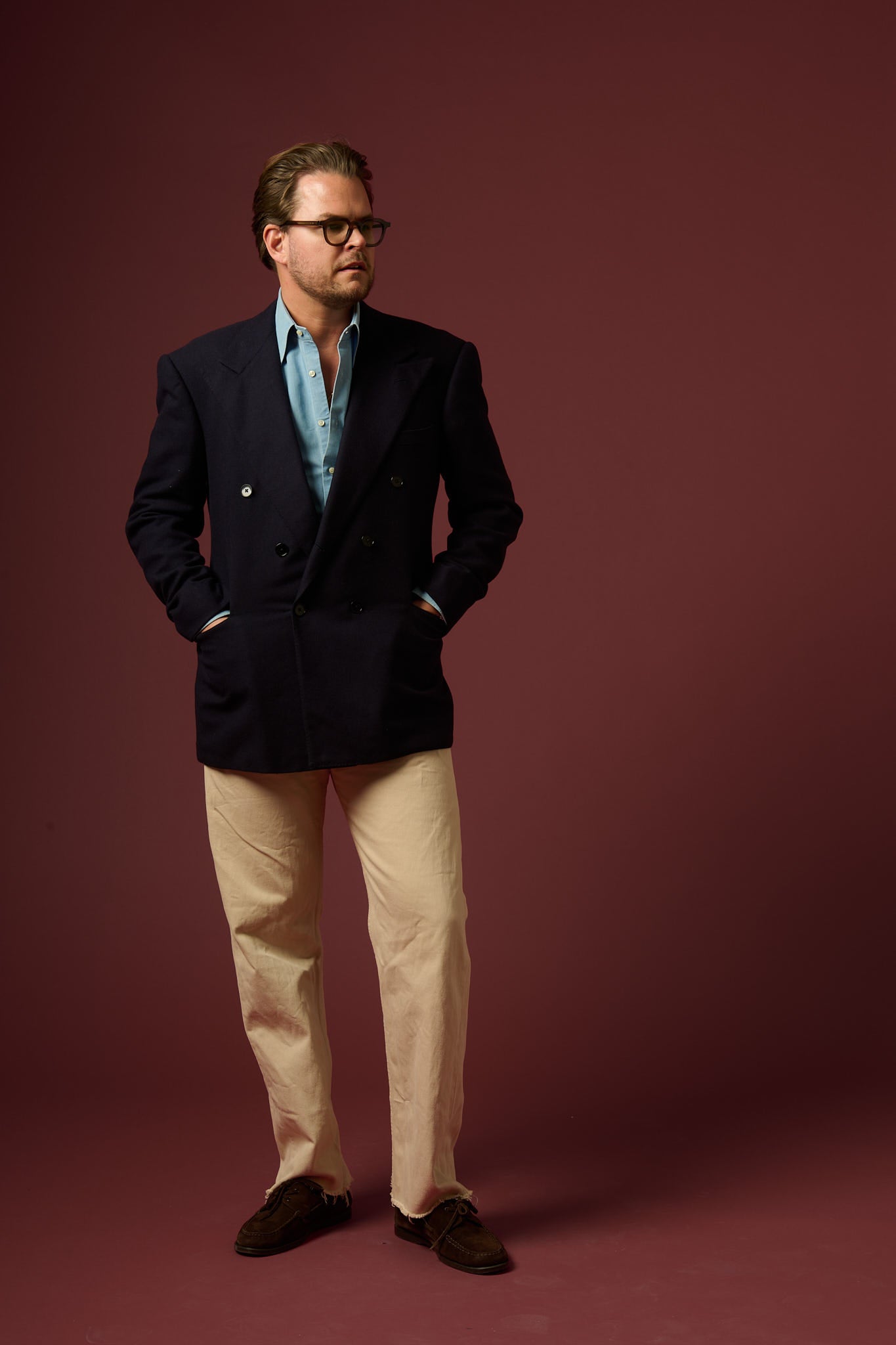Popoverskjortans knappslå består av totalt fyra knappar (tre bröstknappar och en kragknapp) samt en avslutande förstärkt triangelsöm. Om du frågar oss så funkar de flesta kombinationer till popovern så länge de ger ett avslappnat intryck.