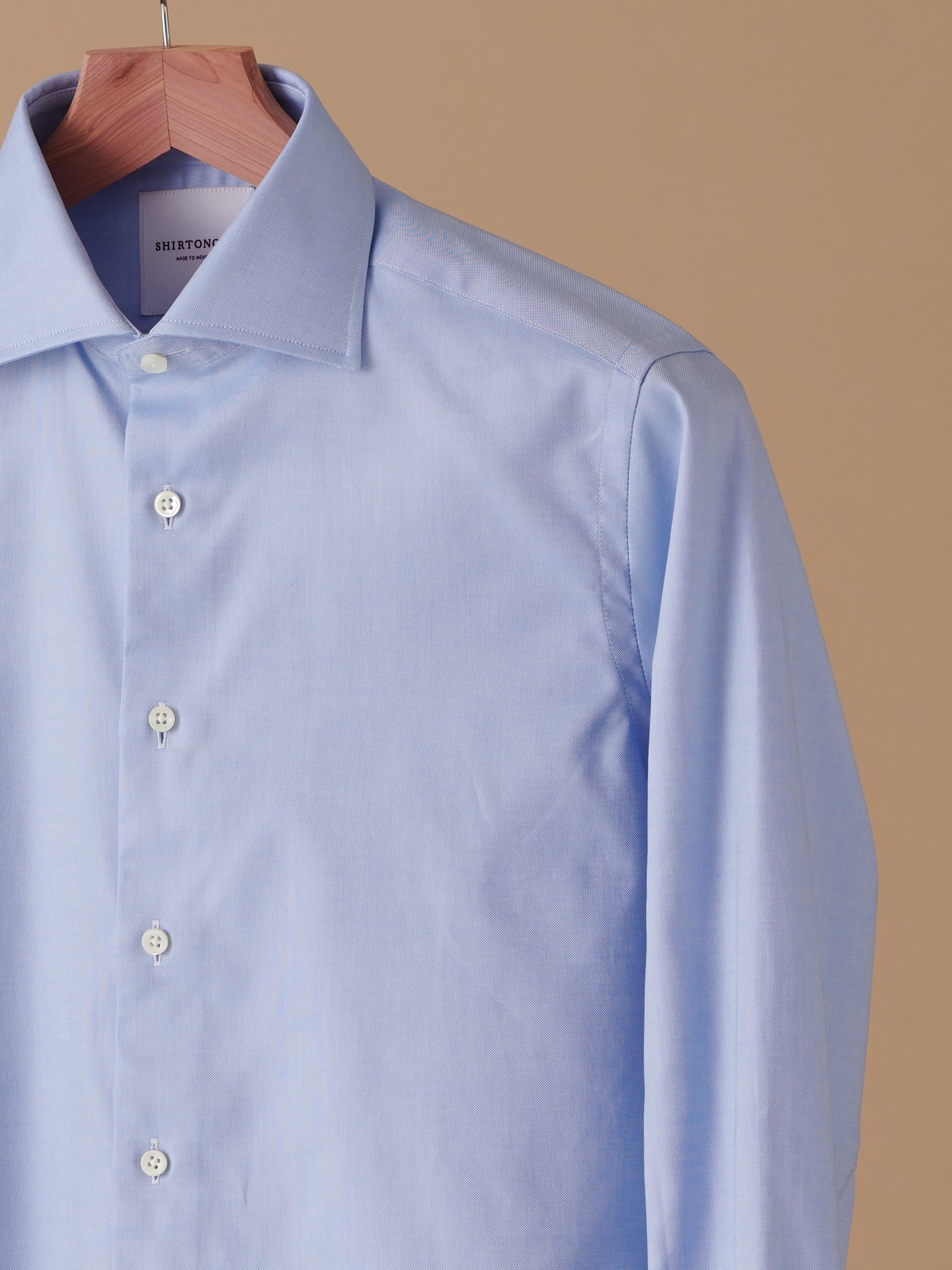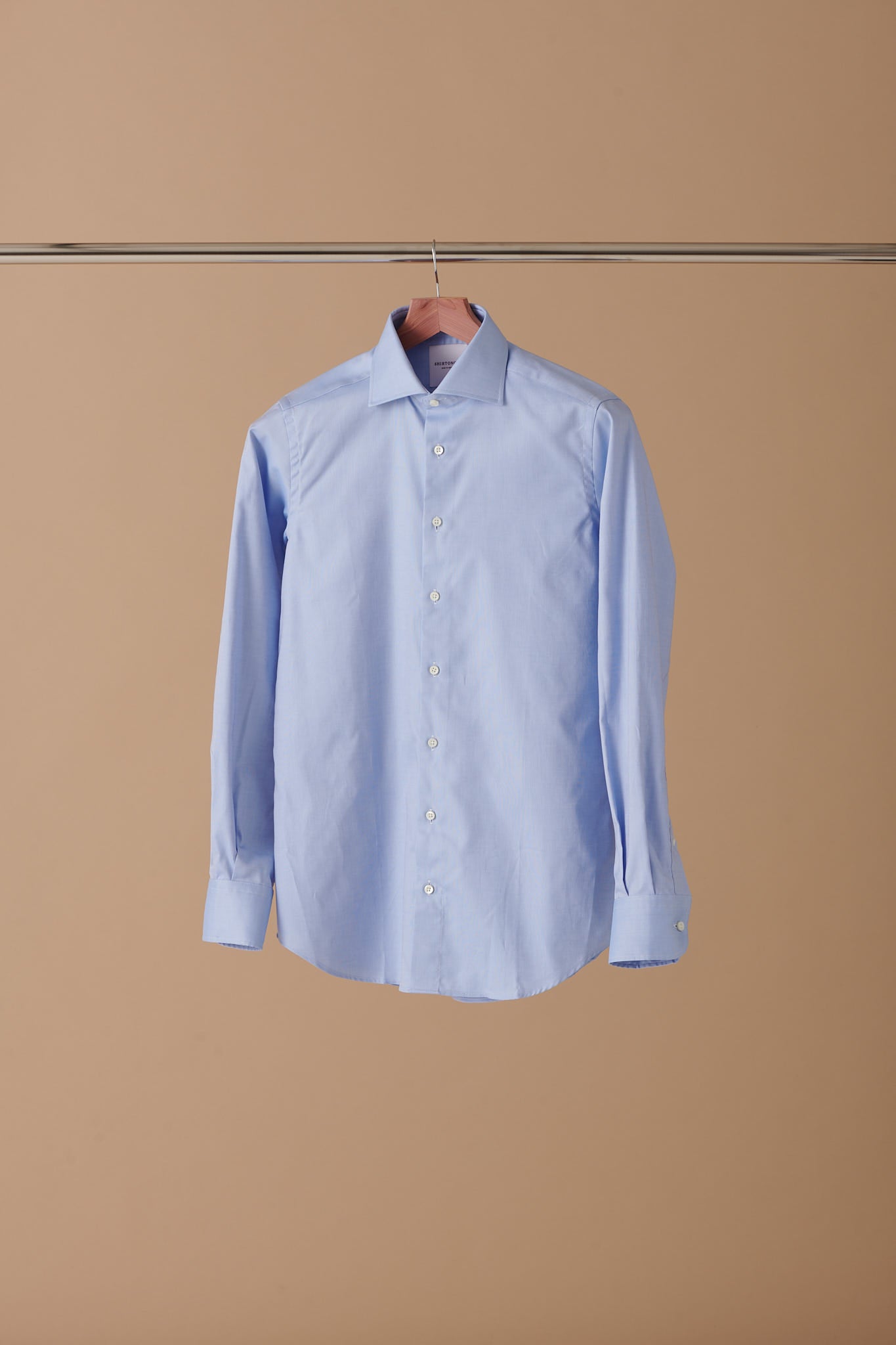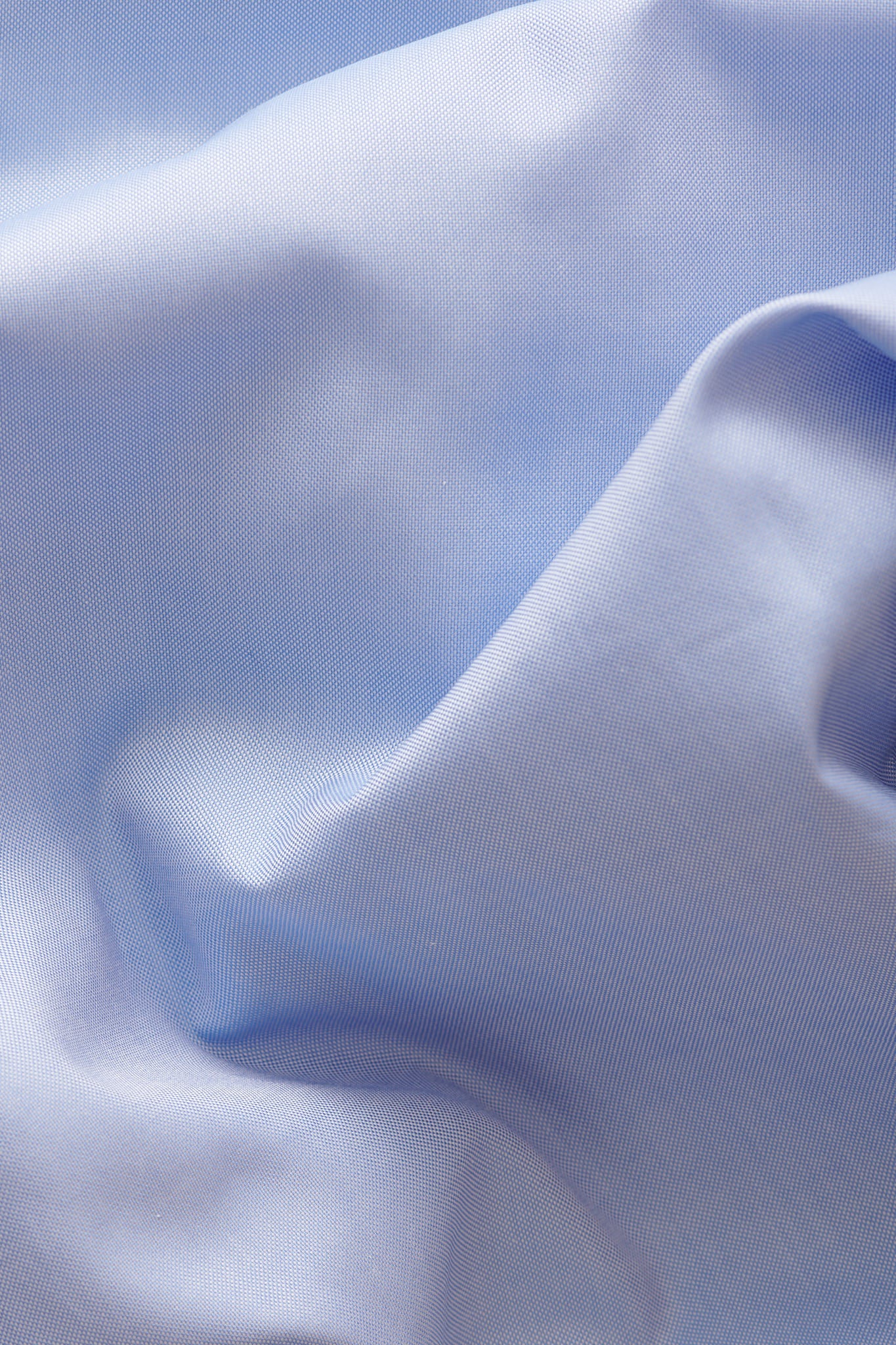Mellanblå pinpoint tillhör klassikerna tack vare tygets mjuka känsla och breda användningsområde. Tygets väv skapar mer struktur än vanlig poplinväv, samtidigt som den inte är lika grov som en typisk oxford. Med andra ord ett mångsidigt tyg som passar utmärkt i de flesta sammanhang, med eller utan slips. Låt dina val av krage och manschett styras av hur pass formell framtoning du eftersträvar. Tyget vävs i Italien och består av dubbeltvinnat garn av långfibrig bomull, vilket gör det både mjukt och skrynkeltåligt.