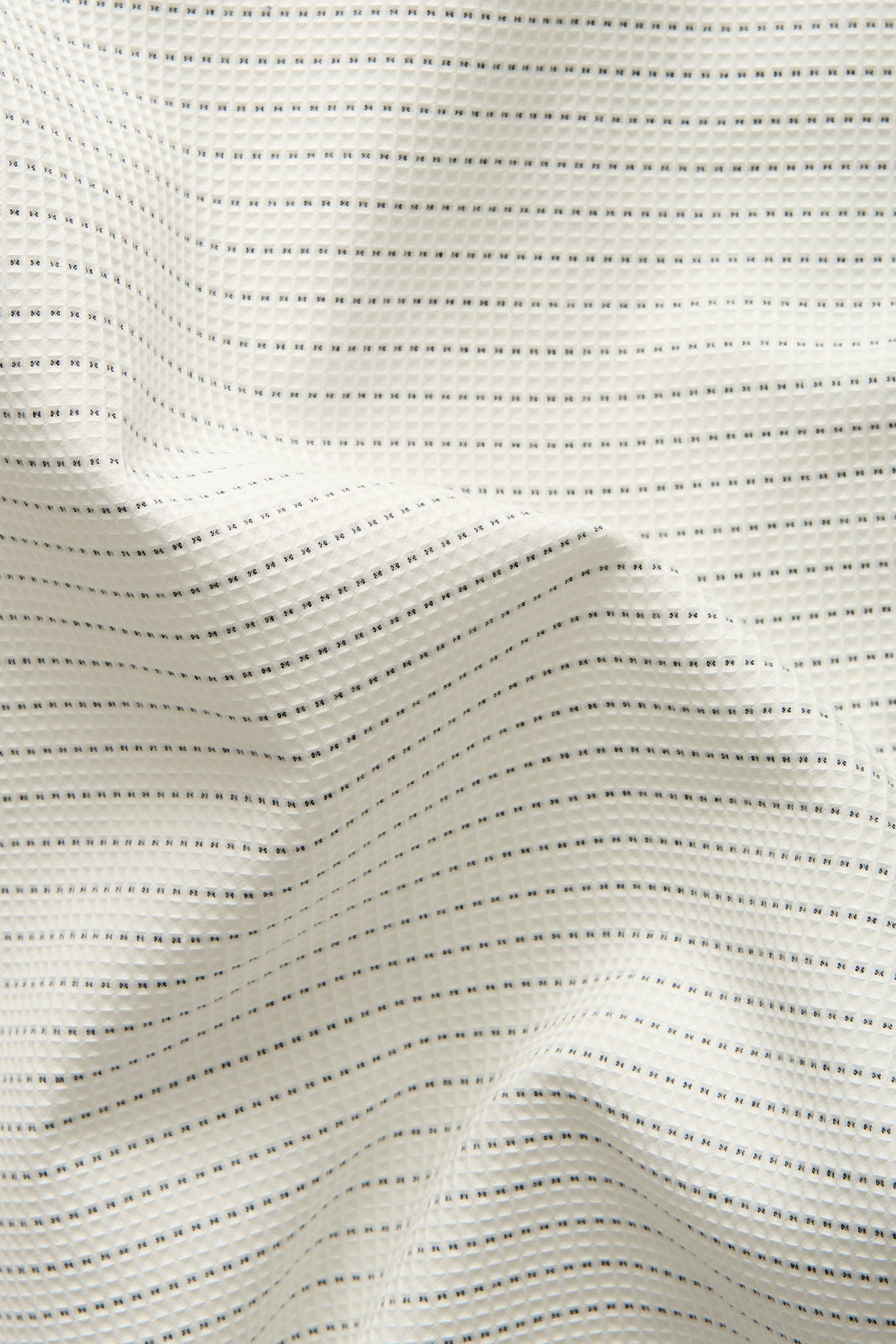 Våfflad overshirt i bomull med svart vågrät rand, inspirerad av avslappnade semesterdagar på 70-talet. Ett ledigt men genomtänkt alternativ till både kavaj och kofta. Praktisk, elegant och stilfull på samma gång. Bärs med fördel över en t-shirt eller skjorta för en avslappnad men samlad silhuett. Den grova våffelväven i bomull ger tyget struktur, tyngd och ett följsamt fall. Övriga detaljer består av camp collar med rullande slag, pärlemorknappar i Gizo, två bröstfickor med lock, rak nederkant med diskreta slitsar för ökad komfort samt enkel manschett. Vi rekommenderar att du gör denna skjorta något kortare och lite boxigare. (OBS: designen för våra overshirts är låst och kan inte alterneras). OBS: TÄNK PÅ ATT DU BEHÖVER SKAPA EN SPECIFIK MÅTTPROFIL VID BESTÄLLNING AV OVERSHIRT!