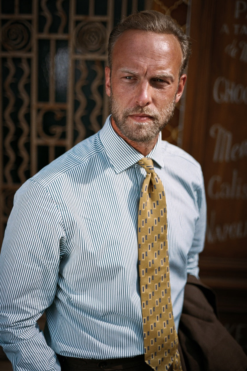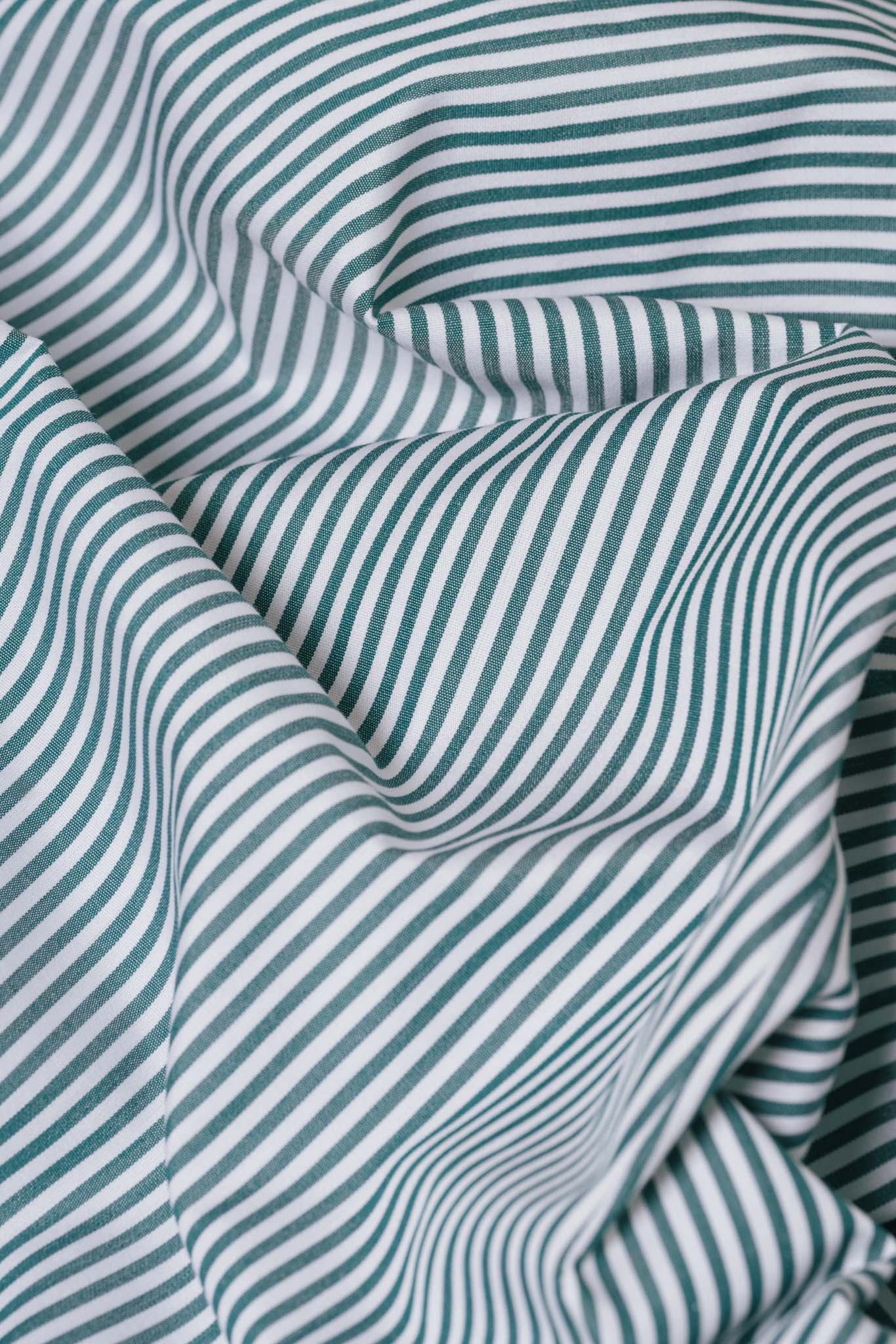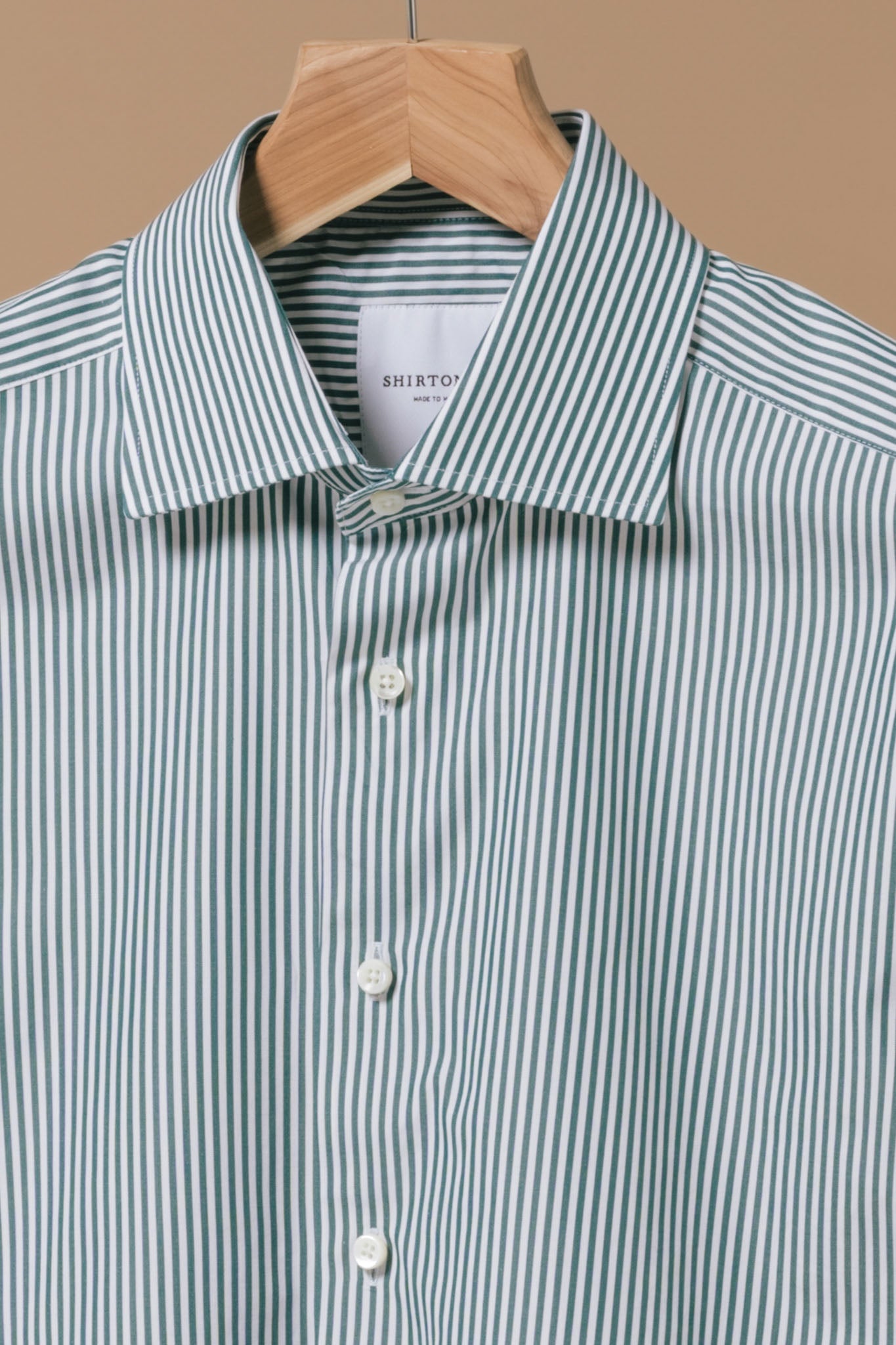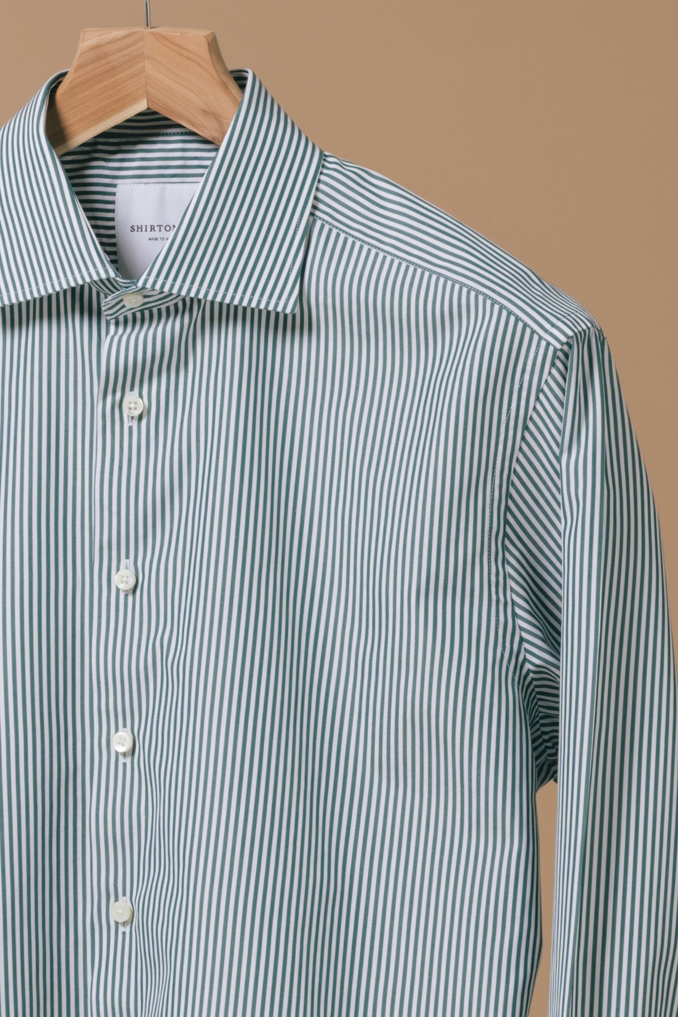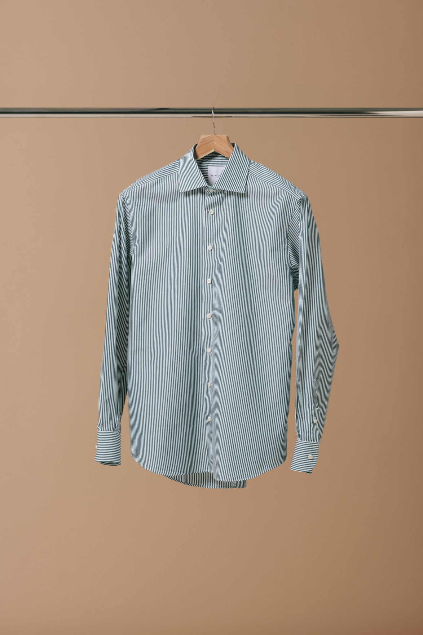 Den gröna bengalranden är ett fräscht alternativ som för tankarna till brittisk tradition och sportig elegans. Passar lika bra med cutaway- som med button down-krage, beroende på användningstillfälle och personlig preferens. Tyget vävs i Italien av dubbeltvinnat garn från långfibrig egyptisk bomull och har en god förmåga att motstå skrynklor.
