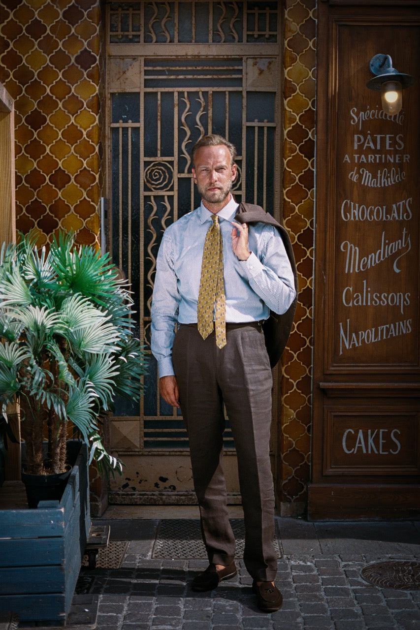 Popoverskjortans knappslå består av totalt fyra knappar (tre bröstknappar och en kragknapp) samt en avslutande förstärkt triangelsöm. Om du frågar oss så funkar de flesta kombinationer till popovern så länge de ger ett avslappnat intryck.